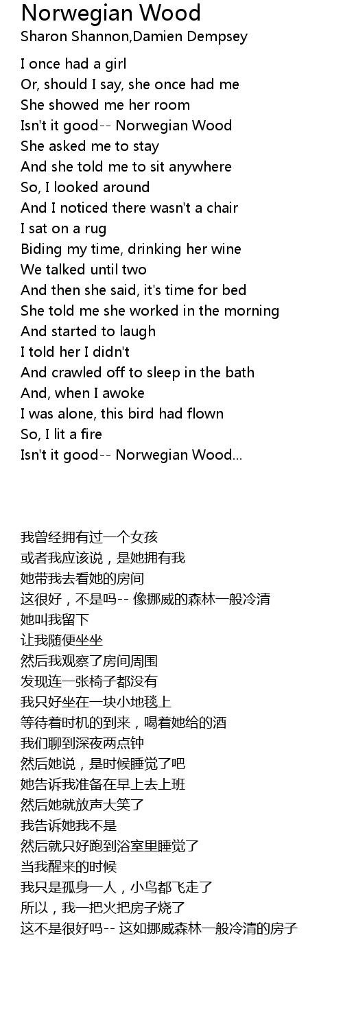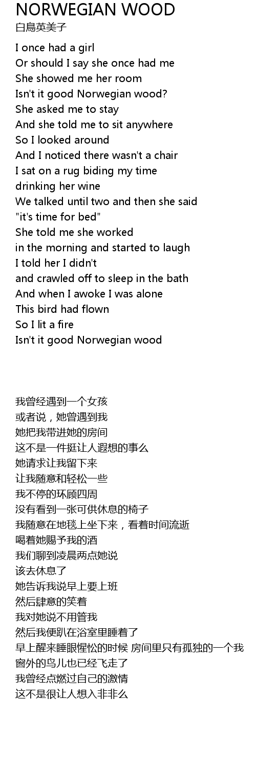 Norwegian Wood (This Bird Has Flown), Provided to YouTube by Universal Music Group Norwegian Wood (This Bird Has Flown) · The Beatles Rubber Soul ℗ 2009 . We Have got 6 images about Norwegian Wood Lyrics images, photos, pictures, backgrounds, and more. In such page, we additionally have number of images out there. Such as png, jpg, animated gifs, pic art, symbol, blackandwhite, picture, etc. "The Beatles - Norwegian Wood (Cover)", A song from The Beatles' 1965 Album Rubber Soul. Of setting fires and sitar strings.. "How The Beatles Made "Norwegian Wood"", Patreon: https://www.patreon.com/Thehollyhobs Listen to my First Album on Itunes, Spotify, Apple Music, literally EVERYWHERE ..